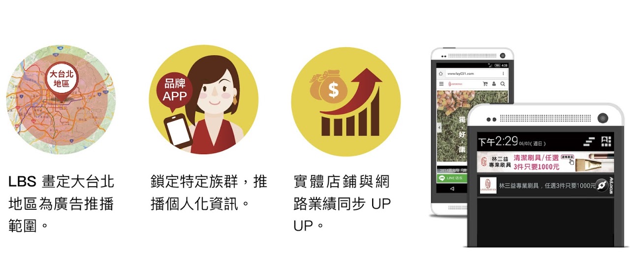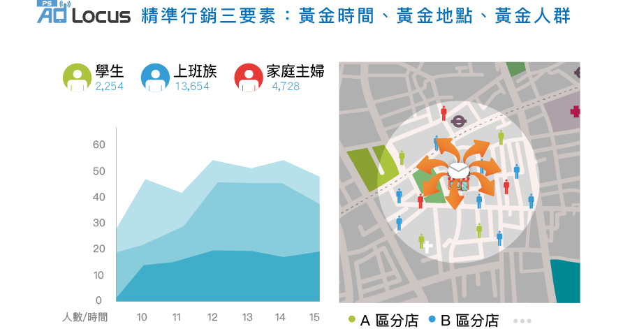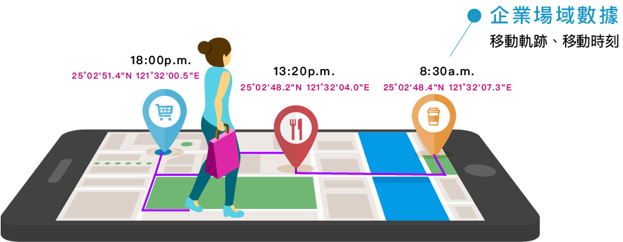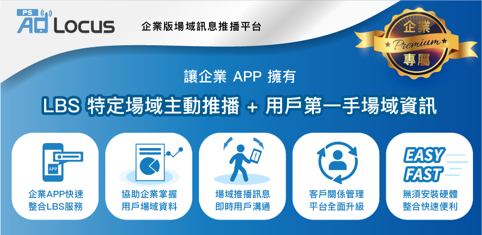 AdLocus PS 企業版提供企業主以場域為核心的全方位數位行銷科技服務,協助企業主統合大量的用戶場域資料,了解用戶的移動軌跡,建立企業專屬之場域數據。場域數據結合人工智慧技術,可預測消費者的輪廓標籤與興趣喜好,同時亦可整合企業內部的用戶行為數據,包含: 電子商務網站記錄、銷售資料紀錄、庫存管理系統紀錄等,讓企業主多面向的瞭解消費者,進而作為擬定行銷策略的重要參考。